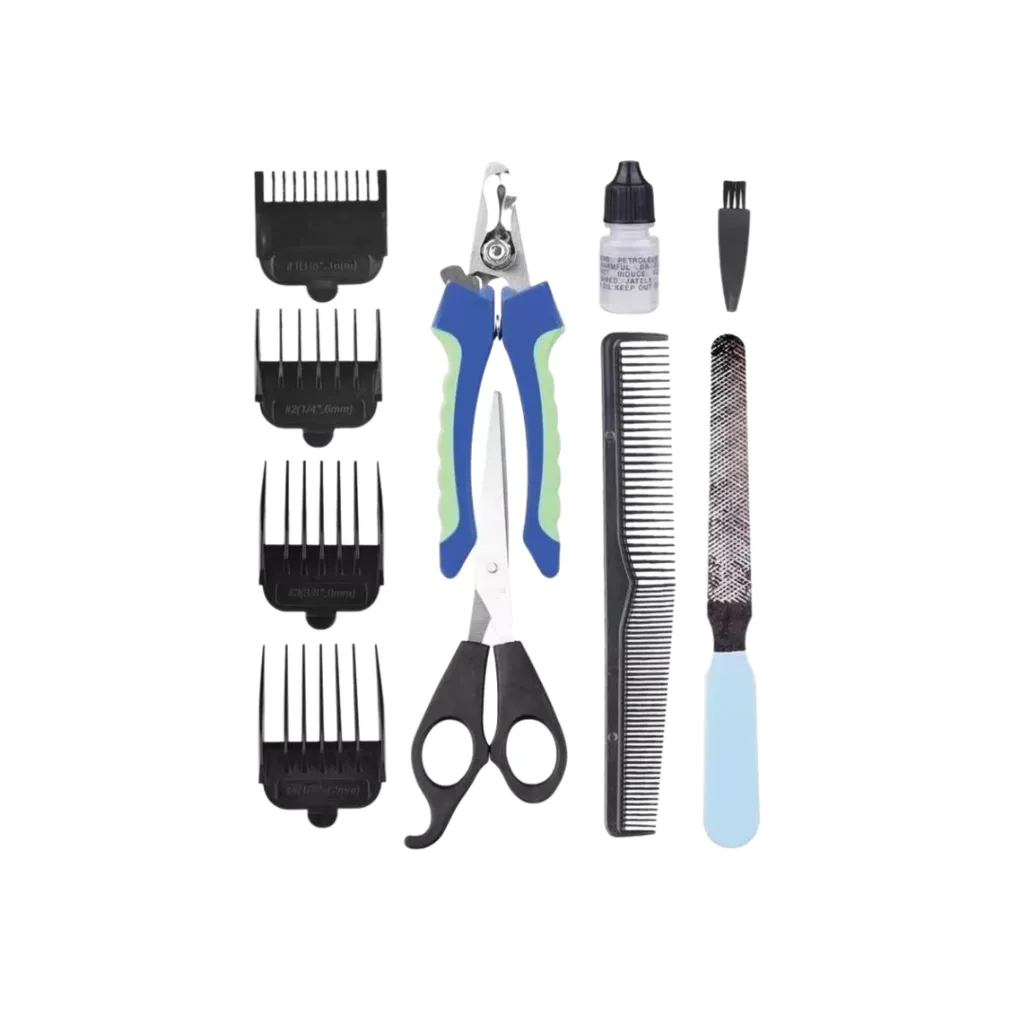Incluye cortadora eléctrica, tijeras, peine, aceite lubricante, cepillo de limpieza, corta uñas, lima y 4 niveles de corte.